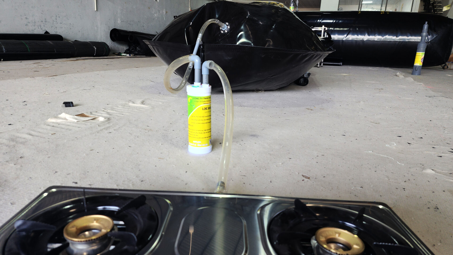Lắp ống dẫn khí từ túi vào bếp. Gắn bình lọc khí và van an toàn trên đường dây. Bơm nước vào túi cho đến khi ngập qua ống xả. Sau đó bắt đầu xả phân. Khoảng 20-30 ngày sau, túi sẽ căng phồng và bắt đầu sinh gas.