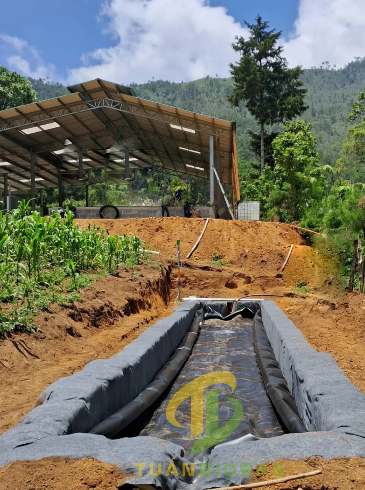 Đặt túi vào hố, nối ống dẫn chất thải từ chuồng vào đầu vào của túi, và nối ống xả sang hố lắng.